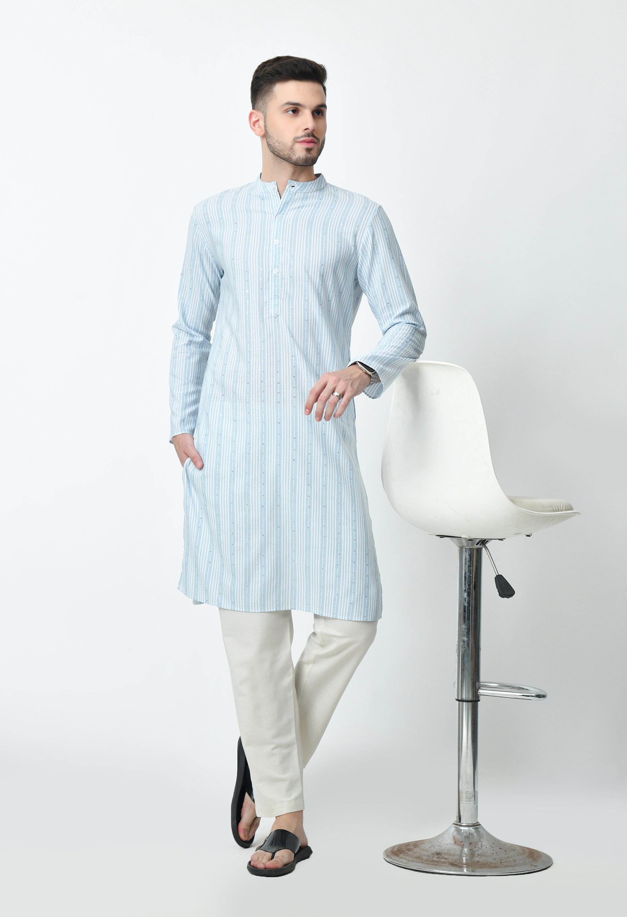 Stay stylish and comfortable with our embellished full-sleeve cotton blend kurta for men. Made with high-quality cotton blend fabric, this kurta features intricate embellishments that add a touch of elegance to your wardrobe. The full sleeves provide added coverage without compromising on style. Perfect for any occasion.