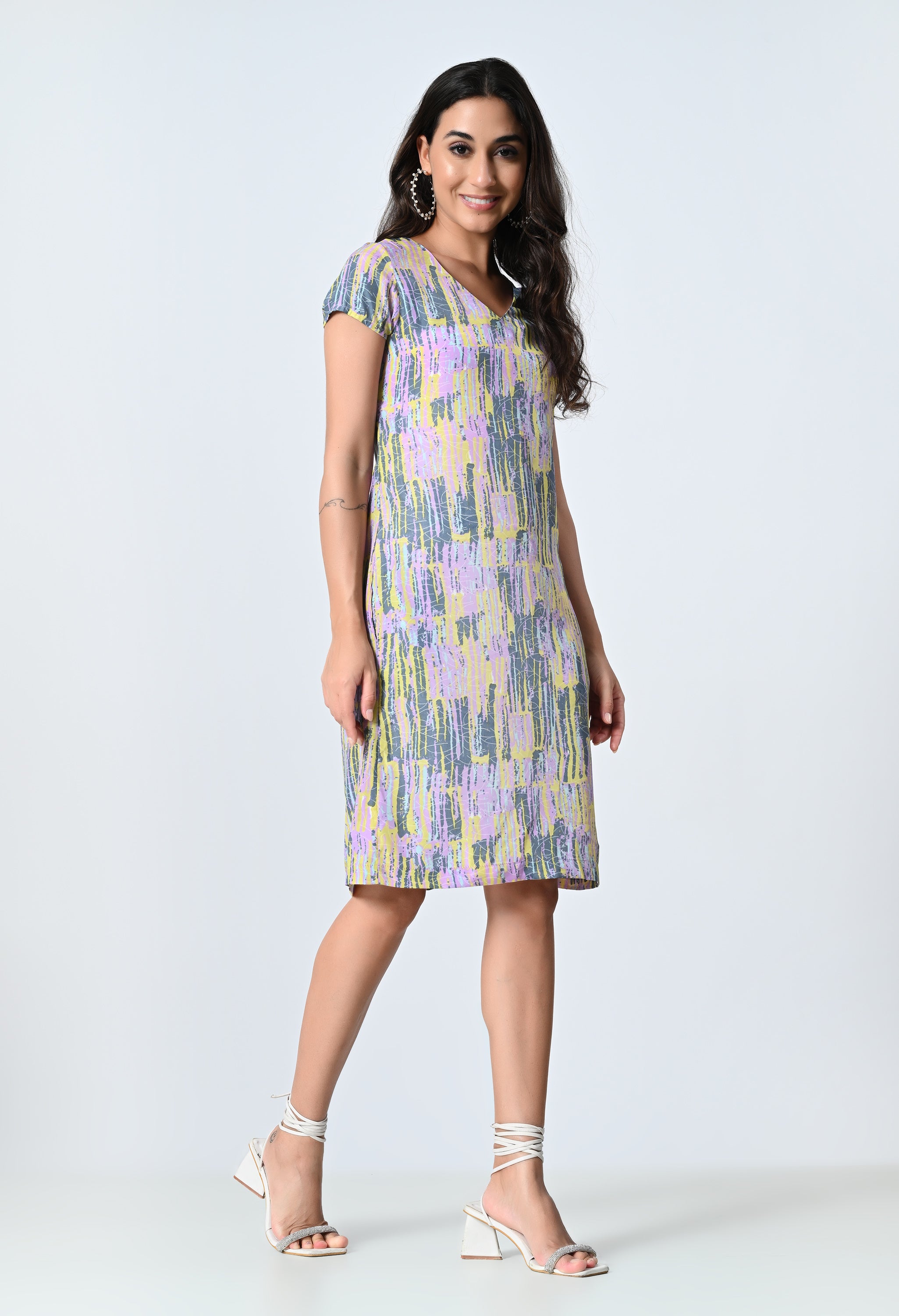Expertly crafted from poly crepe, this multicolor printed half-sleeve dress for women offers both style and comfort. With its knee-length design, it's the perfect versatile piece for any occasion. Elevate your wardrobe with this must-have dress.