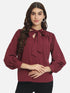 Expertly crafted from high-quality poly crepe, this maroon solid tie-up neck top for women is the perfect addition to your wardrobe. With a unique cuff-sleeve design and a stylish tie-up neck, this top is both sophisticated and versatile. Elevate any outfit with this must-have piece.