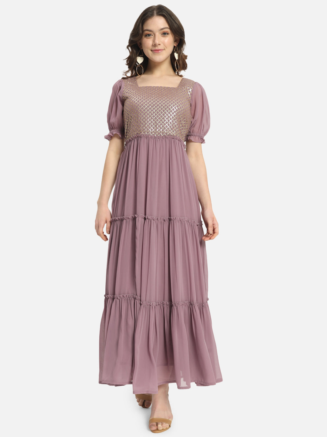 Crafted from soft and lightweight poly georgette fabric, this embellished pink half-sleeve ankle-length dress for women offers a comfortable and elegant fit. The delicate embellishments add a touch of sophistication, making it perfect for special occasions. Experience the perfect blend of style and comfort with this dress.