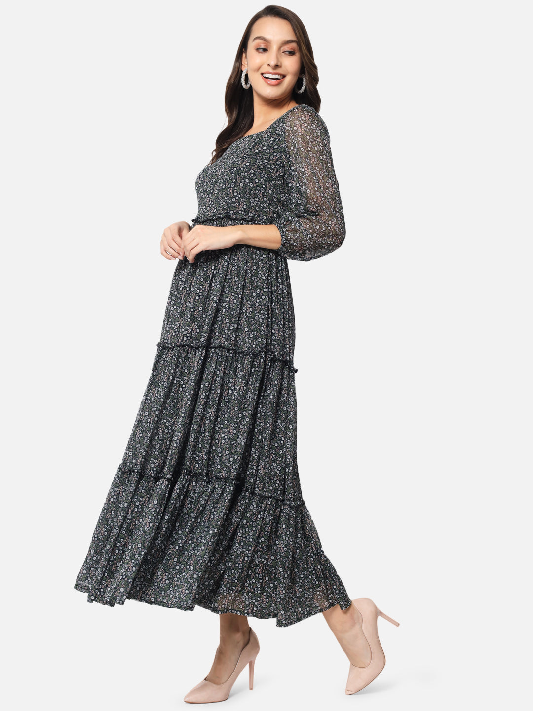 Elevate your style with our floral black ankle length dress for women. Made of lightweight poly georgette, this dress features a flattering square neck design. Perfect for any occasion, this dress is a must-have addition to your wardrobe.
